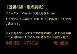 アナル 【近親相姦・肛虐調教】 ドラッグストアのパート美人母さん(48)、 クラブオーナーの息子(21)に「肛門奴●」として差し出される。 息子の指とアナルプラグで背徳の開発、夫との電話中に二穴同時中出しでイかされる白衣の肉便器・菊江【暴虐同盟】